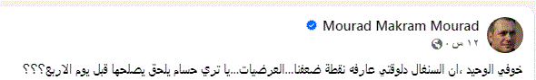 حيث كتب مراد مكرم من خلال حسابه على موقع التواصل الاجتماعي فيسبوك قائلا: