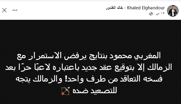 المغربي محمود بنتايج يرفض الاستمرار مع الزمالك إلا بتوقيع عقد جديد باعتباره لاعبًا حرًا بعد فسخه التعاقد من طرف واحد! والزمالك يتجه للتصعيد ضده