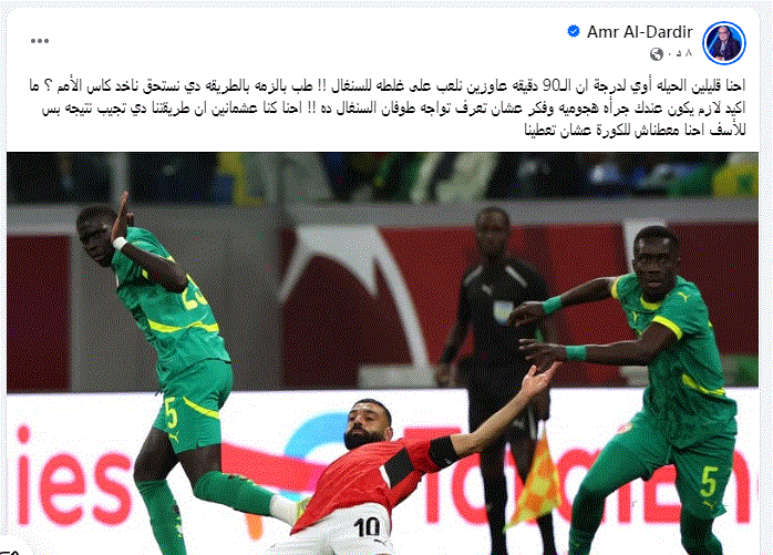 علق الاعلامي والناقد الرياضي عمرو الدردير على خسارة منتخب مصر أمام السنغال بهدف للاشئ في نصف نهائي كأس الأمم الأفريقية و خسارة فرصة الفوز باللقب.