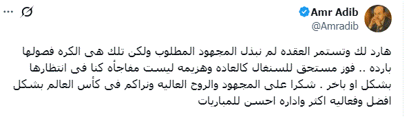 وتابع: فوز مستحق للسنغال كالعاده وهزيمه ليست مفاجأه كنا فى انتظارها بشكل او باخر . شكرا على المجهود والروح العاليه ونراكم فى كأس العالم بشكل افضل وفعاليه اكثر واداره احسن للمباريات