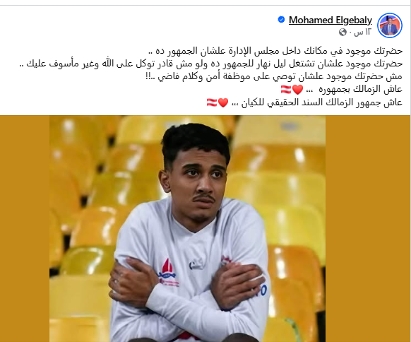 صورة تؤكد أن الزمالك لجماهيرة، بعيداً عن الادارات التى لا تشعر بالجمهور، ليعلق الجبالى موجهاً رسالته للإدارة.