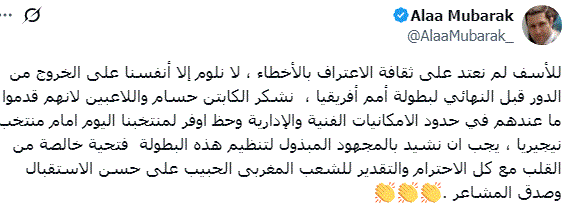 للأسف لم نعتد على ثقافة الاعتراف بالأخطاء ، لا نلوم إلا أنفسنا على الخروج من الدور قبل النهائي لبطولة أمم أفريقيا ، نشكر الكابتن حسام واللاعبين لانهم قدموا ما عندهم في حدود الامكانيات الفنية والإدارية وحظ اوفر لمنتخبنا اليوم امام منتخب نيجيريا ، يجب ان نشيد بالمجهود المبذول لتنظيم هذه البطولة فتحية خالصة من القلب مع كل الاحترام والتقدير للشعب المغربى الحبيب على حسن الاستقبال وصدق المشاعر
