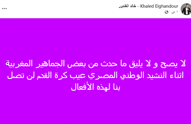 لا يصح و لا يليق ما حدث من بعض الجماهير المغربية اثناء النشيد الوطني المصري عيب كرة القدم لن تصل بنا لهذه الأفعال