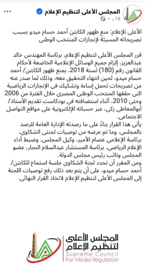 أعلن المجلس الأعلى لتنظيم الإعلام صدور قرار يقضي بمنع ظهور أحمد حسام ميدو في جميع الوسائل الإعلامية الخاضعة لأحكام القانون رقم (180) لسنة 2018، وذلك لحين الانتهاء من التحقيقات الجارية بشأنه.