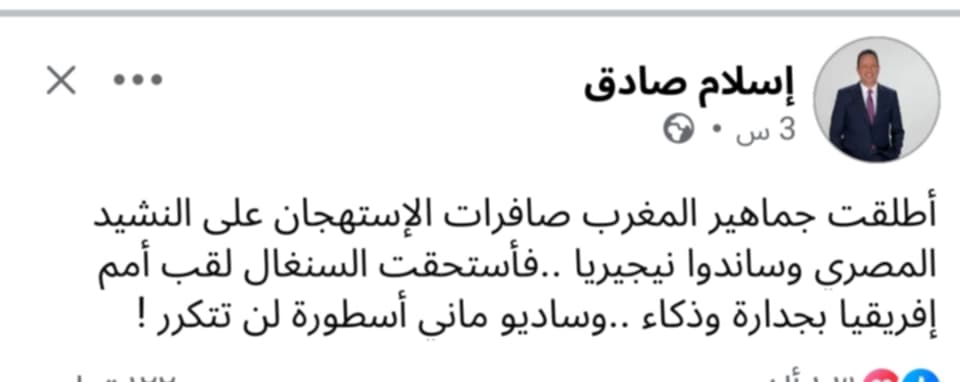 علق الناقد الرياضى اسلام صادق على لقطة ساديو مانى نجم منتخب السنغال ورفضة الانسحاب من لقاء المغرب بالأمس.
