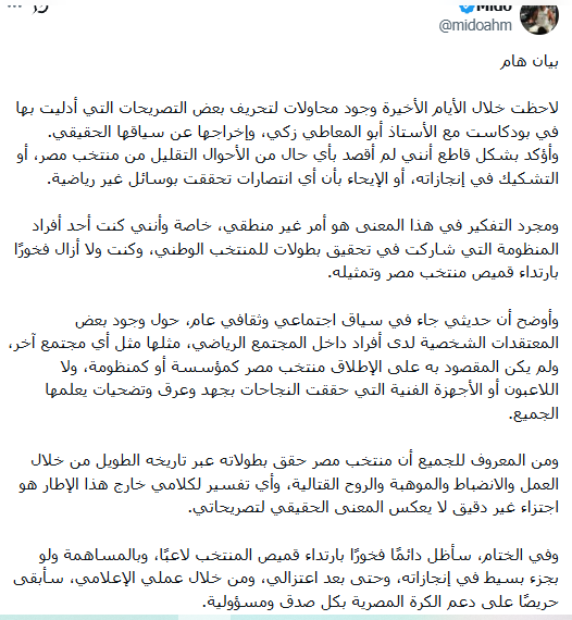 وعبر صفحته الشخصية على موقع التواصل الاجتماعى أكس كتب أحمد حسام ميدو قائلاً :