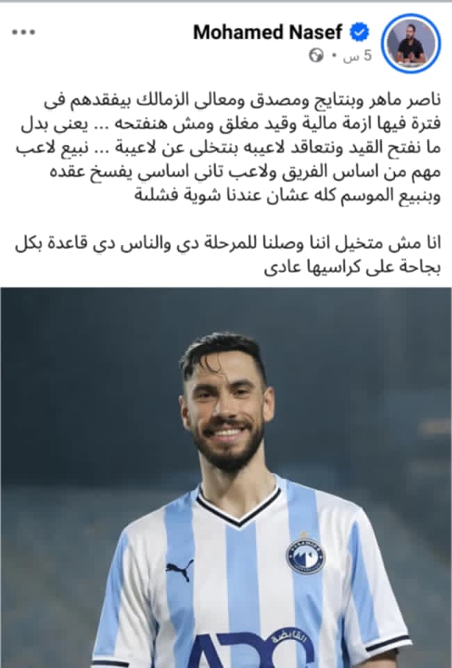 الامر الذى تم بالامس انتقد محمد ناصف فكرة الموافقة على رحيل اللاعب، فى ظل الاحتياج الفنى، وبالطبع فى ظل ايقاف القيد.