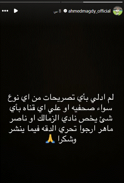 لم أدلى بأى تصريحات من اى نوع سواء صحفية أو على أى قناة بأى شئ يخص الزمالك أو ناصر ماهر