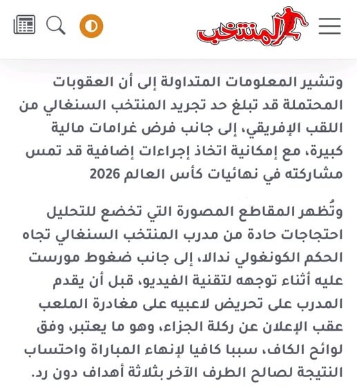 وبحسب المعطيات المتداولة فإن العقوبات المحتملة قد تصل إلى تجريد المنتخب السنغالي من اللقب الإفريقي :على حد قول الصحيفة المغربية" إلى جانب فرض غرامات مالية كبيرة، مع احتمال اتخاذ إجراءات إضافية قد تؤثر على مشاركته في نهائيات كأس العالم 2026.