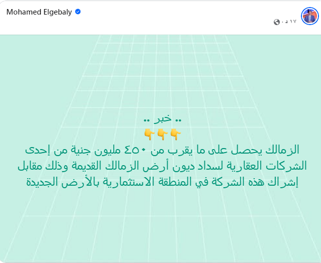 الزمالك يحصل على ما يقرب من ٤٥٠ مليون جنية من إحدى الشركات العقارية لسداد ديون أرض الزمالك القديمة وذلك مقابل إشراك هذه الشركة في المنطقة الاستثمارية بالأرض الجديدة