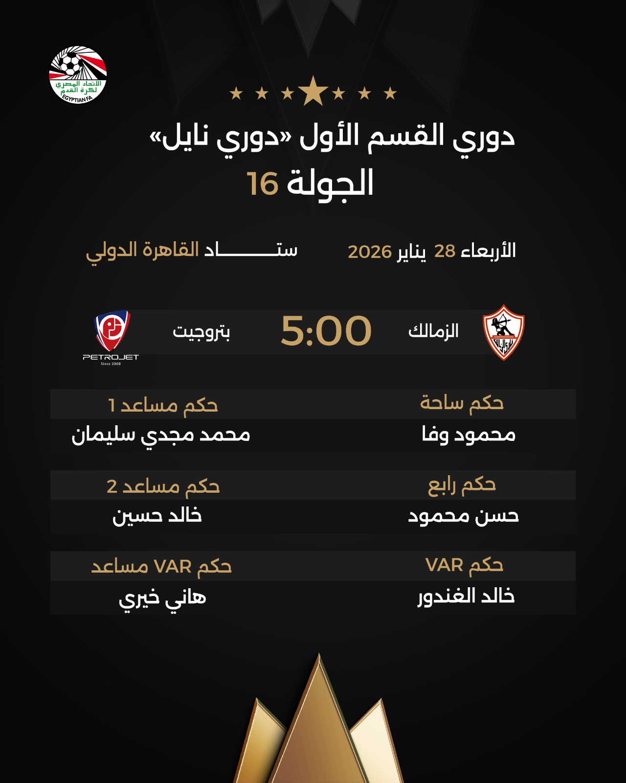 كشفت لجنة الحكام الرئيسية في الاتحاد المصري لكرة القدم عن طاقم تحكيم مباراة الزمالك وبتروجيت في الدوري.