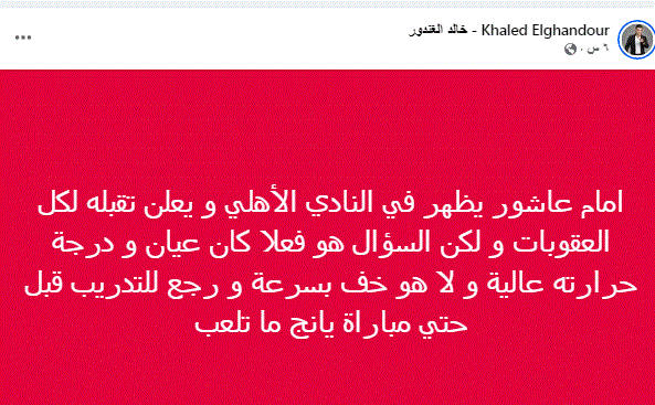 حيث كتب الغندور قائلا: امام عاشور يظهر في النادي الأهلي و يعلن تقبله لكل العقوبات و لكن السؤال هو فعلا كان عيان و درجة حرارته عالية و لا هو خف بسرعة و رجع للتدريب قبل حتي مباراة يانج ما تلعب