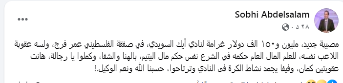 مصيبة جديد، مليون و١٥٠ ألف دولار غرامة لنادي أيك السويدي، في صفقة الفلسطيني عمر فرج، ولسه عقوبة اللاعب نفسه.