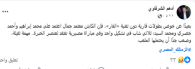 بعيدًا عن خوض بطولات قارية دون تقنية «الفار»، فإن الكابتن معتمد جمال اعتمد على محمد إبراهيم وأحمد خضري ومحمد السيد؛ ثلاثي شاب في تشكيل واحد وفي مباراة مصيرية تفتقد لعنصر الخبرة..