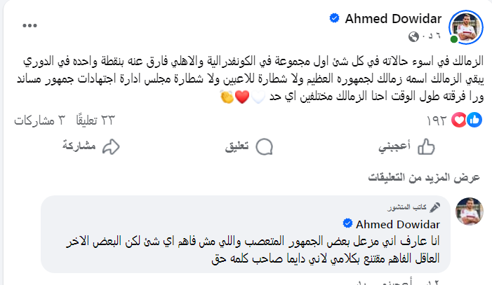 وعبر صفحته الشخصية على موقع التواصل الاجتماعى فيس بوك كتب أحمد دويدار قائلاً :