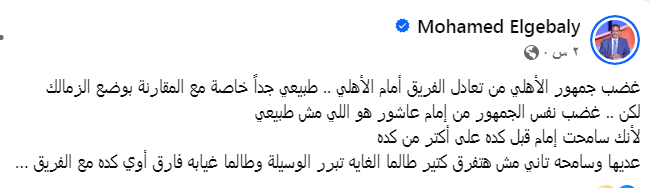 قارن الناقد الرياضى محمد الجبالي، بين غضب جمهور الاهلى من تعادل الفريق مع البنك الاهلى، وامام عاشور لاعب خط وسط الفريق.