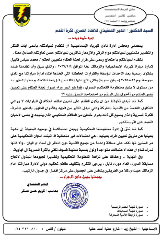 نتقدم لسيادتكم باحتجاج رسمي على قرار لجنة الحكام بتعيين الحكم/ محمد عباس قابيل لإدارة مباراة كهرباء الإسماعيلية والزمالك غدًا الموافق 2026/2/4، والذي سبق وأن تقدمنا ضده بشكوى رسمية بعد الأحداث المؤسفة والقرارات الخاطئة التي اتخذها أثناء إدارته لمباراتنا مع نادي سموحة يوم 26/8/2025 (مرفق صورة)، والتي نتج عنها إيقافه من قبل لجنة التحكيم، نظرًا لما ظهر به من مستوى لا يليق بمنظومة التحكيم المصرية.