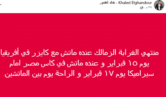 منتهي الغرابة الزمالك عنده ماتش مع كايزر في أفريقيا يوم ١٥ فبراير و عنده ماتش في كاس مصر امام سيراميكا يوم ١٧ فبراير و الراحة يوم بين الماتشين