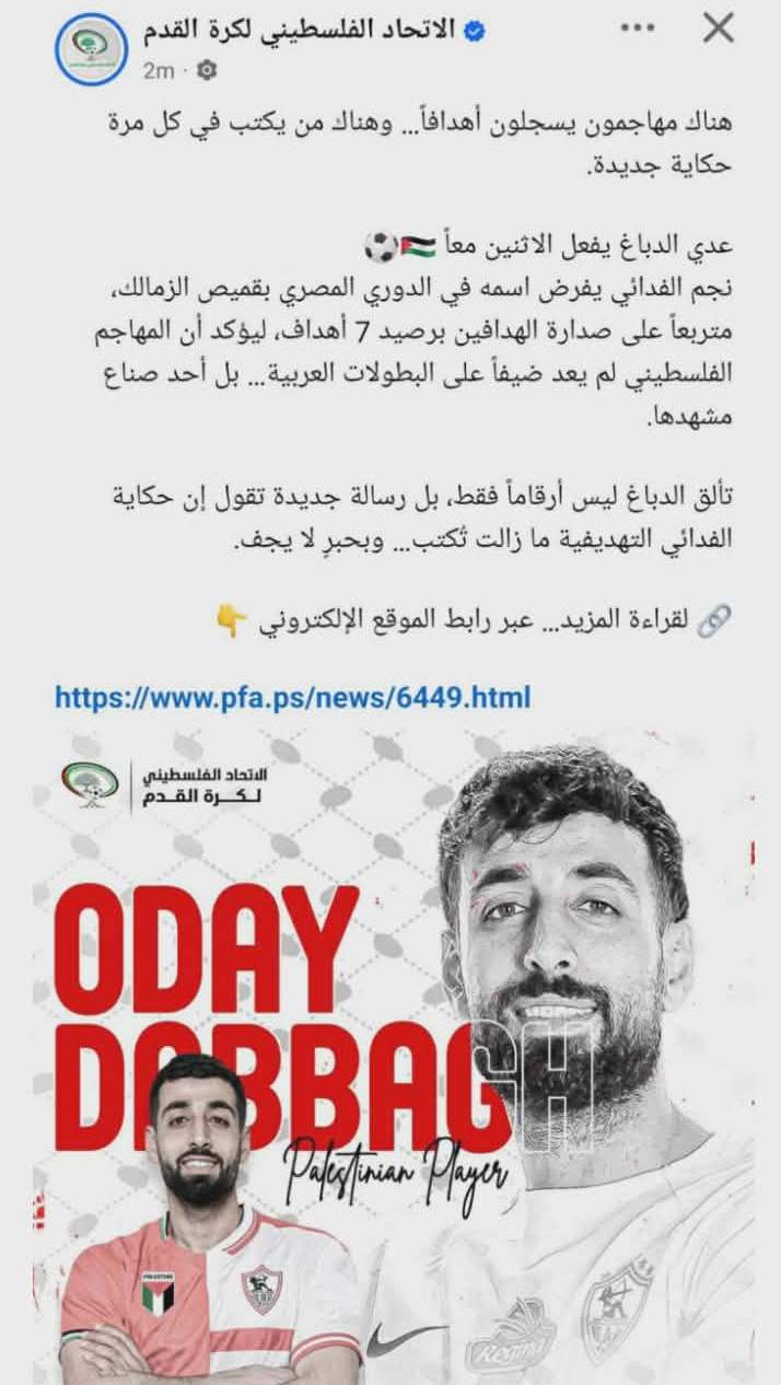 أثنى الاتحاد الفلسطيني لكرة القدم على المستوى المميز الذي يقدمه عدي الدباغ لاعب الزمالك ومنتخب فلسطين.