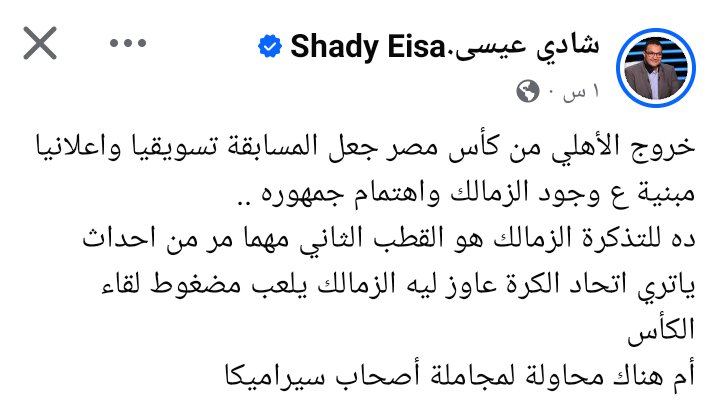خروج الأهلي من كأس مصر جعل المسابقة تسويقيا واعلانيا مبنية ع وجود الزمالك واهتمام جمهوره ..
