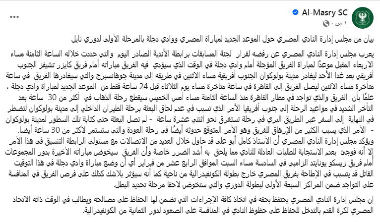 أصدر مجلس إدارة النادي المصري بيان رسمي أعرب فيه عن اعتراضه على القرار الصادر من لجنة المسابقات برابطة الأندية، والذي حدد مساء الأربعاء القادم موعد جديد للمباراة المؤجلة أمام وادي دجلة.