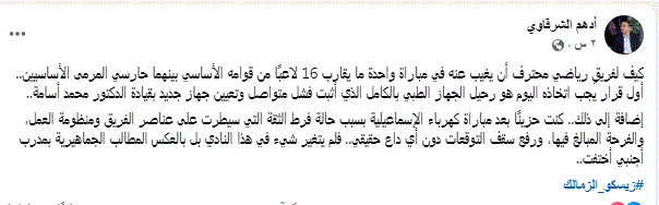 كيف لفريقٍ رياضي محترف أن يغيب عنه في مباراة واحدة ما يقارب 16 لاعبًا من قوامه الأساسي بينهما حارسي المرمى الأساسيين.. أول قرار يجب اتخاذه اليوم هو رحيل الجهاز الطبي بالكامل الذي أثبت فشل متواصل وتعيين جهاز جديد بقيادة الدكتور محمد أسامة..