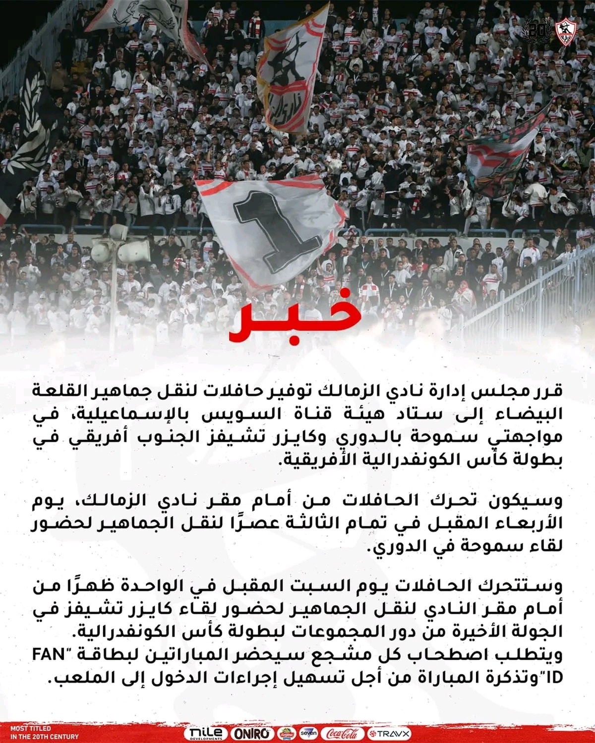 ادارة الزمالك قررت توفير حافلات من أمام بوابة نادي الزمالك لنقل الجماهير الى ملعب هيئة قناة السويس يومي الأربعاء والسبت القادمين