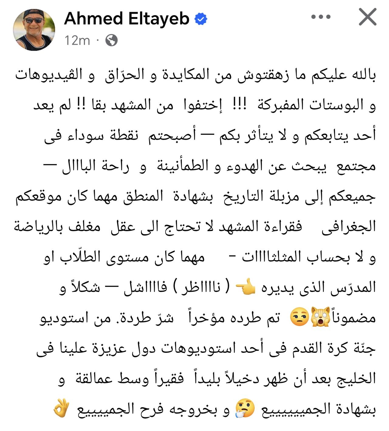 وعبر صفحته الشخصية على موقع التواصل الاجتماعى فيس كتب احمد الطيب معلقاً :
