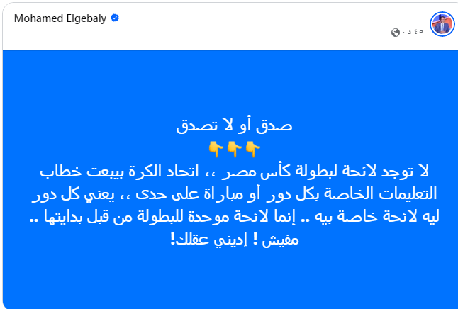 حيث أكد أنه لا يوجد لائحة لمسابقة كأس مصر بالمعنى المتعارف عليه، وإنما مجرد خطابات من اتحاد الكرة خاصة بكل دور من أدوار البطولة.