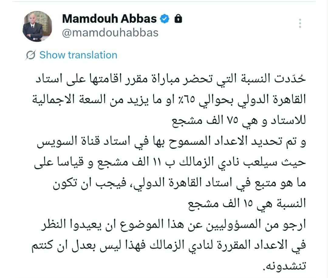 حيث الجهات المعنية حددت 10 آلاف متفرج لجمهور الزمالك، بينما هناك أندية أخرى ستلعب مباراتها الأفريقية بأضعاف هذا العدد، ليعلق ممدوح عباس.