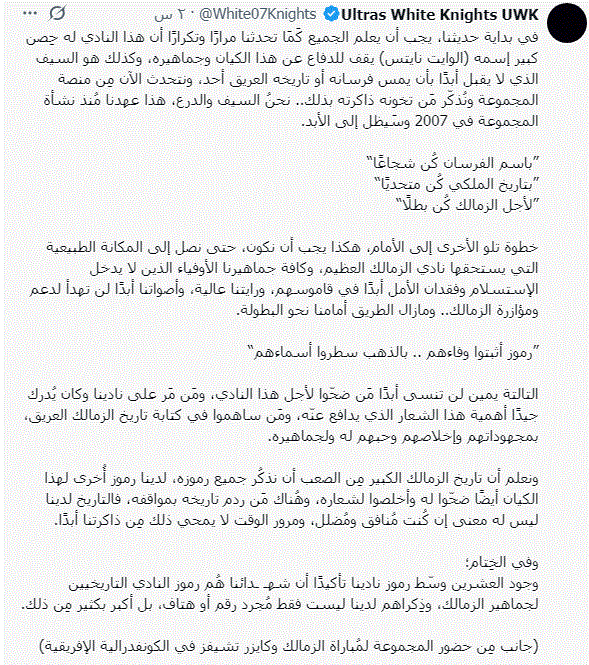 في بداية حديثنا، يجب أن يعلم الجميع كَمَا تحدثنا مرارًا وتكرارًا أن هذا النادي له حِصن كبير إسمه (الوايت نايتس) يقف للدفاع عن هذا الكيان وجماهيره، وكذلك هو السيف الذي لا يقبل أبدًا بأن يمس فرسانه أو تاريخه العريق أحد، ونتحدث الآن مِن منصة المجموعة ونُذكّر مَن تخونه ذاكرته بذلك.. نحنُ السيف والدرع، هذا عهدنا مُنذ نشأة المجموعة في 2007 وسَيظل إلى الأبد.