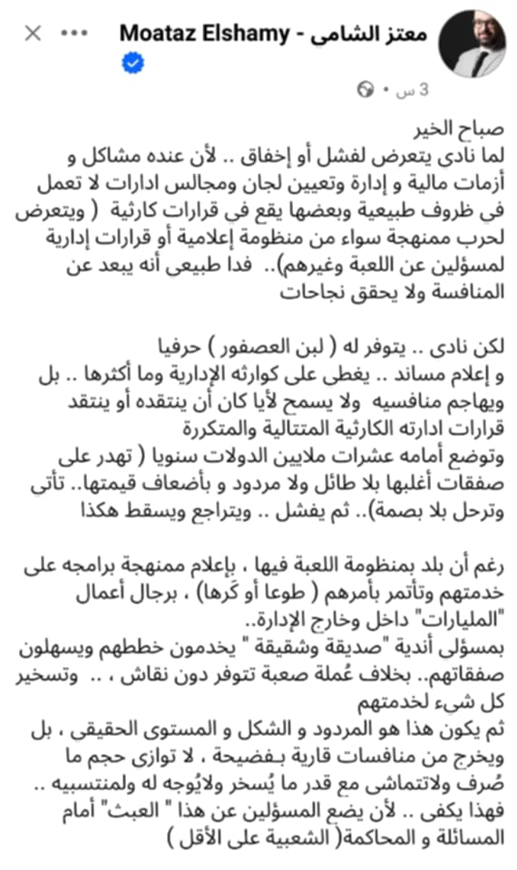 قارن الناقد الرياضى معتز الشامى الوضع فى الزمالك وكلنا عارفين الموقف عامل ازاى، وبين نادى اخر يتم تسهيل له كل شيء.