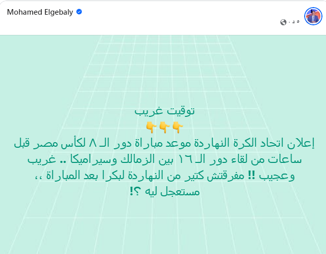 إعلان اتحاد الكرة النهاردة موعد مباراة دور الـ ٨ لكأس مصر قبل ساعات من لقاء دور الـ ١٦ بين الزمالك وسيراميكا .. غريب وعجيب !! مفرقتش كتير من النهاردة لبكرا بعد المباراة ،، مستعجل ليه ؟!