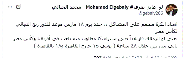 علق الكاتب الصحفي محمد الجبالي على تحديد يوم 18 مارس موعد لربع نهائي كأس مصر.