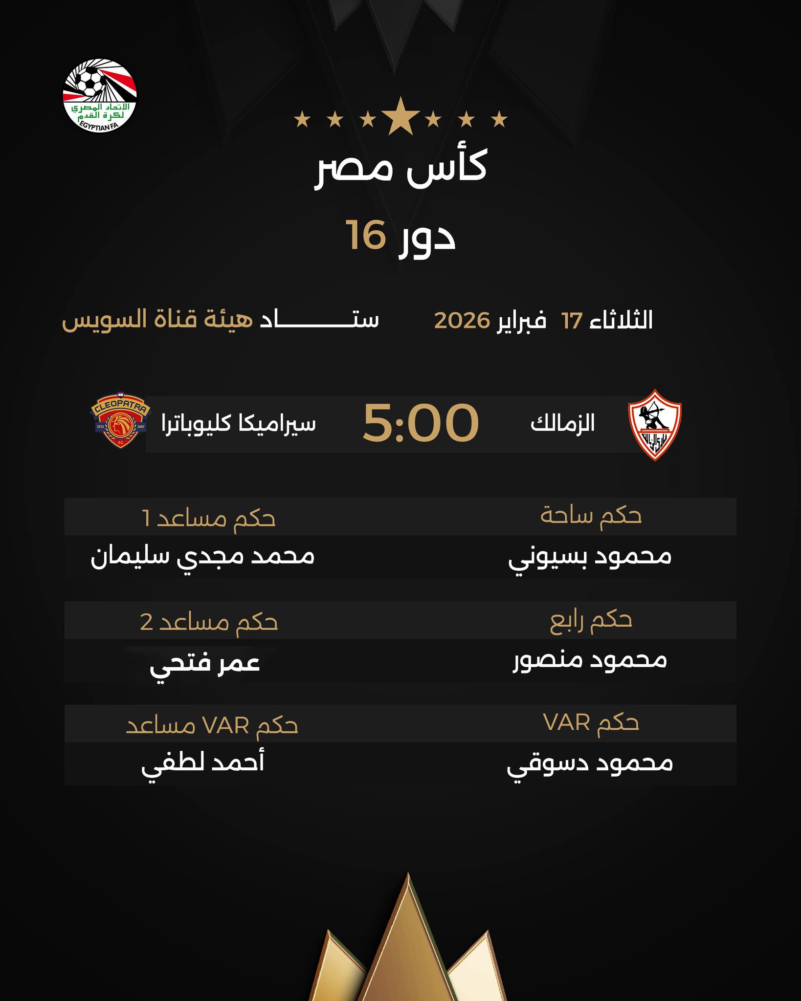 كشفت لجنة الحكام باتحاد الكرة، عن حكام مباراة اليوم للزمالك امام سيراميكا كيلوبترا في دور الـ 16 من بطولة كأس مصر.