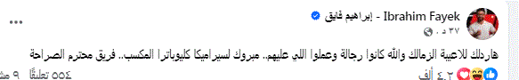 وكتب ابراهيم فايق من خلال حسابه على موقع التواصل الاجتماعي فيسبوك قائلا: