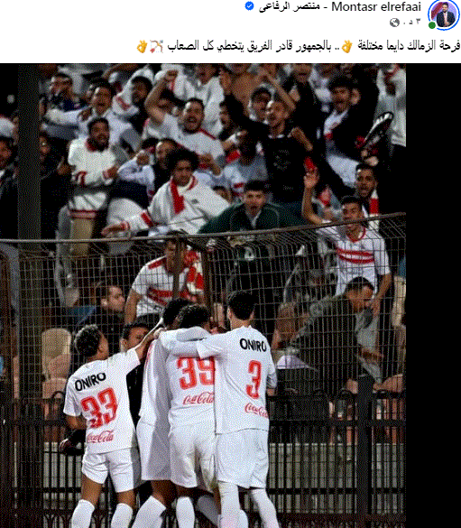 حيث أشاد منتصر الرفاعي بجمهور الزمالك والذي يعتبر أبرز عناصر تحقيق الفوز في المباريات مؤخرا.