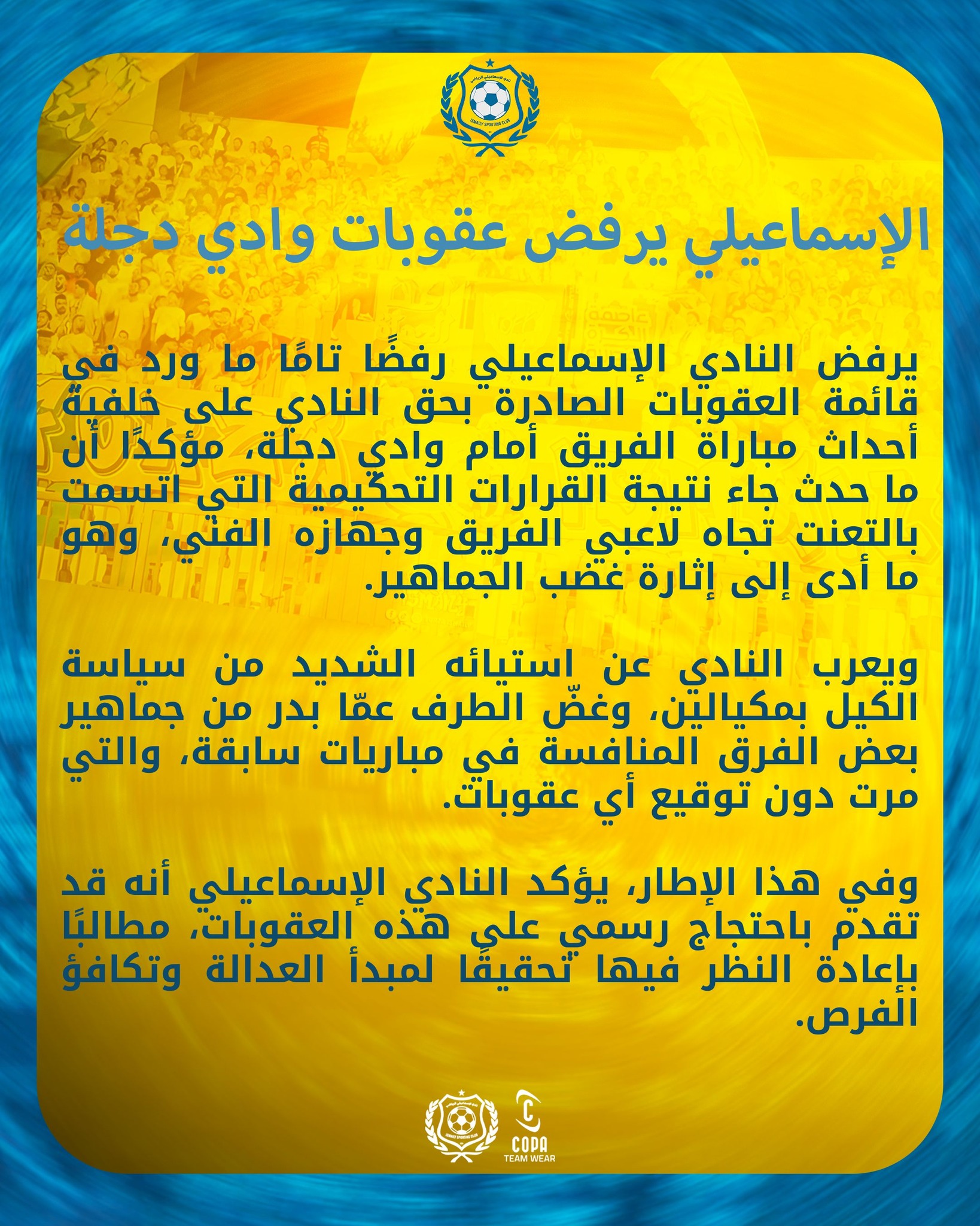 أصدر نادي الاسماعيلي بيان رسمي رفض فيه عقوبات رابطة الأندية التي صدرت اليوم بسبب مباراة الفريق الأخيرة أمام وادي دجلة في الدوري.