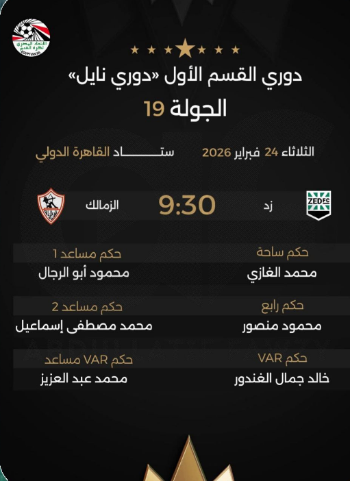 أعلن الاتحاد المصري لكرة القدم عن طاقم تحكيم مباراة الزمالك وزد فى بطولة الدورى العام.