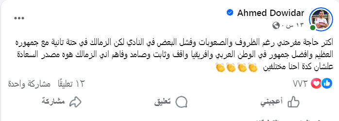 وكتب:أكتر حاجة مفرحني رغم الظروف والصعوبات وفشل البعض في النادي لكن الزمالك في حتة تانية مع جمهوره