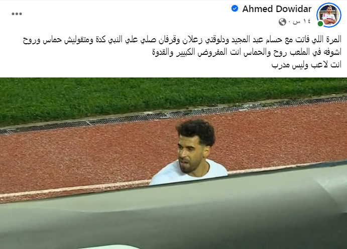 وكتب: المرة اللي فاتت مع حسام عبد المجيد ودلوقتي زعلان وقرفان صلي على النبي كدة ومتقوليش حماس وروح اشوفه في الملعب