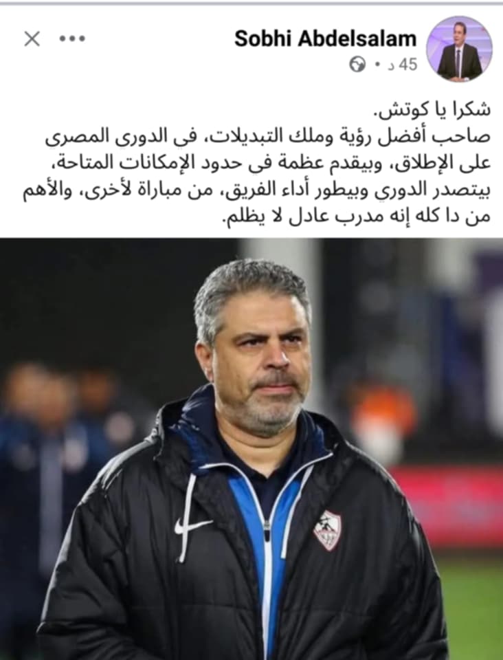 صاحب أفضل رؤية وملك التبديلات، في الدوري المصري على الإطلاق، وبيقدم عظمة في حدود الإمكانات المتاحة، بيتصدر الدوري وبيطور أداء الفريق، من مباراة لأخرى، والأهم من دا كله إنه مدرب عادل، لا يظلم.