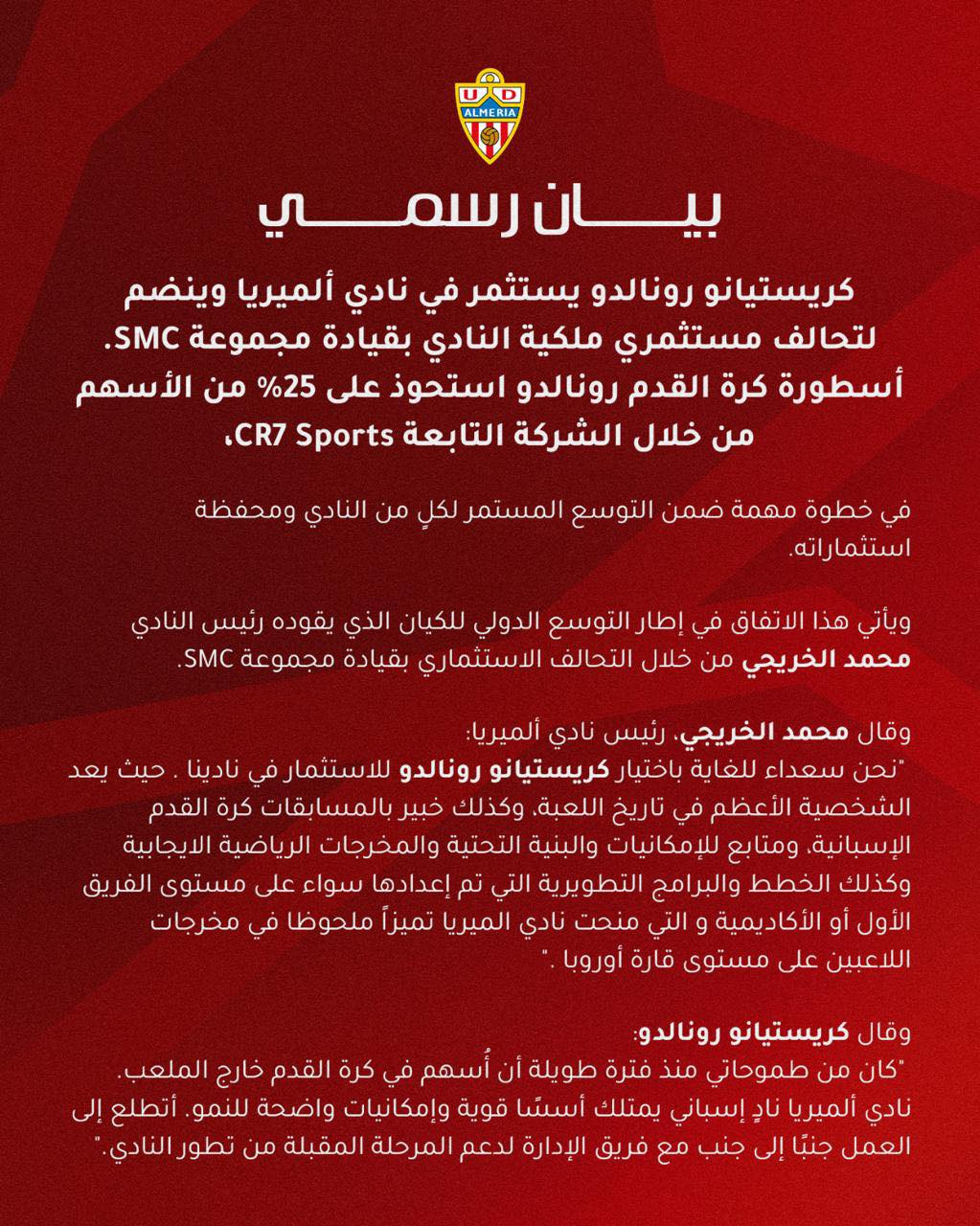 أعلن نادي ألميريا الإسباني رسمياً دخول النجم البرتغالي كريستيانو رونالدو، لاعب النصر السعودي، ضمن قائمة ملاك النادي.