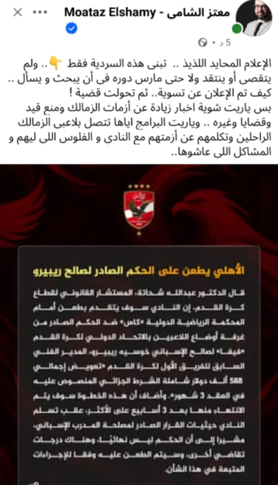 إعلامنا المنافق تجاهل إعلان الأهلى تسوية الأمر مع ريبيرو، وهو ما لم يحدث، لنكتشف بعد ذلك أن هذا لم يحدث ليعلق معتز الشامى.