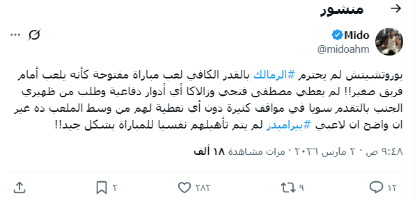 وكتب: يورتشيتش لم يحترم الزمالك بالقدر الكافي، لعب مباراة مفتوحة كأنه يلعب أمام فريق صغير، لم يعط مصطفى فتحي وزلاكة أي أدوار دفاعية، وطلب من ظهيري الجنب بالتقدم سويًا في مواقف كثيرة دون أي تغطية لهم من وسط الملعب،