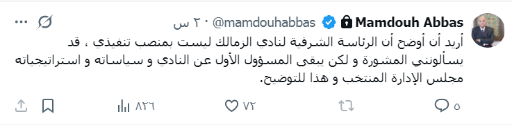 أريد أن أوضح أن الرئاسة الشرفية لنادي الزمالك ليست بمنصب تنفيذي ، قد يسألونني المشورة و لكن يبقى المسؤول الأول عن النادي و سياساته و استراتيجياته مجلس الإدارة المنتخب و هذا للتوضيح.