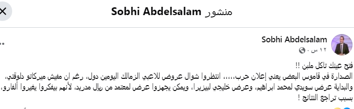 والبداية عرض سويدي لمحمد ابراهيم، وعرض خليجي لبيزيرا، ويمكن يجهزوا عرض لمعتمد من ريال مدريد، لأنهم بيفكروا يغيروا ألفارو، بسبب تراجع النتائج !