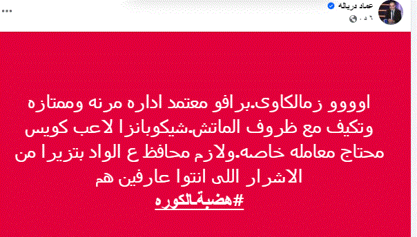 وكتب عماد دربالة من خلال حسابه على موقع التواصل الاجتماعي فيسبوك قائلا: