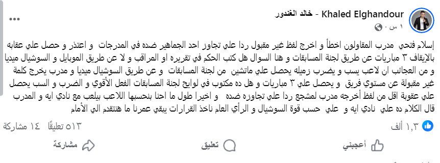 علق الاعلامى خالد الغندور لاعب الزمالك السابق على عقوبة اسلام فتحى مدرب المقاولون العرب بعد هجومه على جمهور الاهلى فى الواقعة المعروفة.