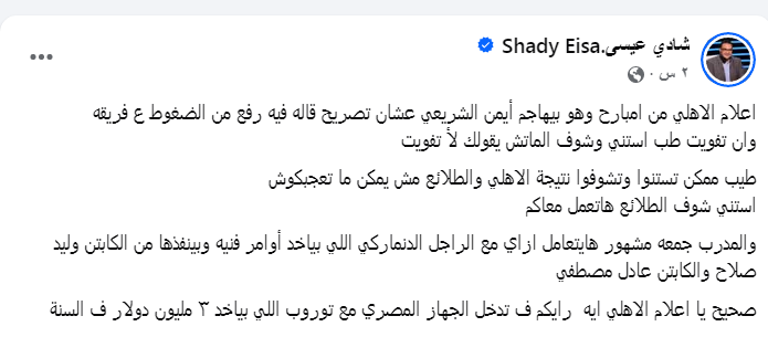 وعبر صفحته الشخصية على موقع التواصل الاجتماعى فيس بوك كتب شادى عيسى معلقاً :